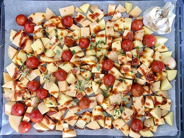 Skala kålroten och tärna den samt potatisarna. Fyll en ugnsplåt täckt med bakplåtspapper med alla grönsaker. Ringla över oljorna och krydda.