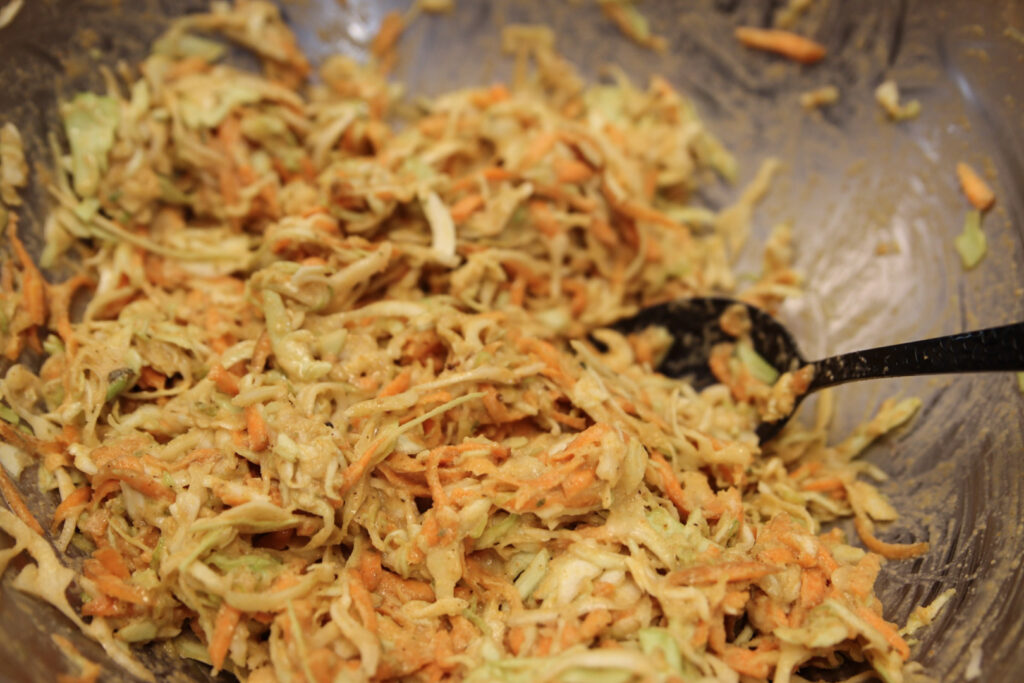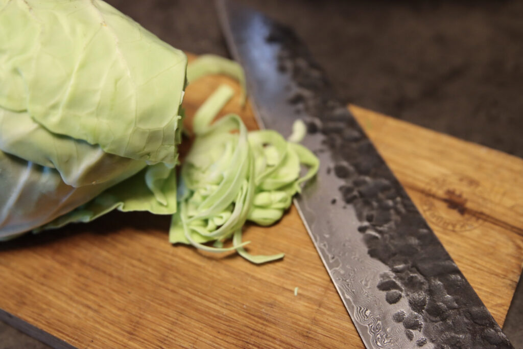 1. Strimla kålen fint och lägg i en skål. Strö över en nypa salt, blanda och låt stå i cirka 20–30 min. Detta frigör vätska som vi häller av.