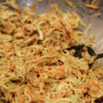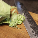 - Strimla kålen fint och lägg i en skål. Strö över en nypa salt, blanda och låt stå i cirka 20–30 min. Detta frigör vätska som vi häller av.