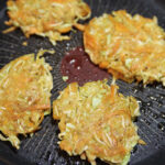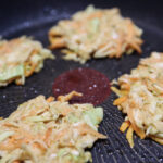 - Hetta upp lite olja i en stekpanna och ta ungefär 1–2 matskedar per fritter med smet och klicka ut i stekpanna.