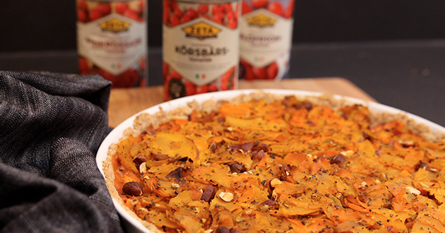 Paj med butternutpumpa, morot, körsbärstomat och hasselnötter
